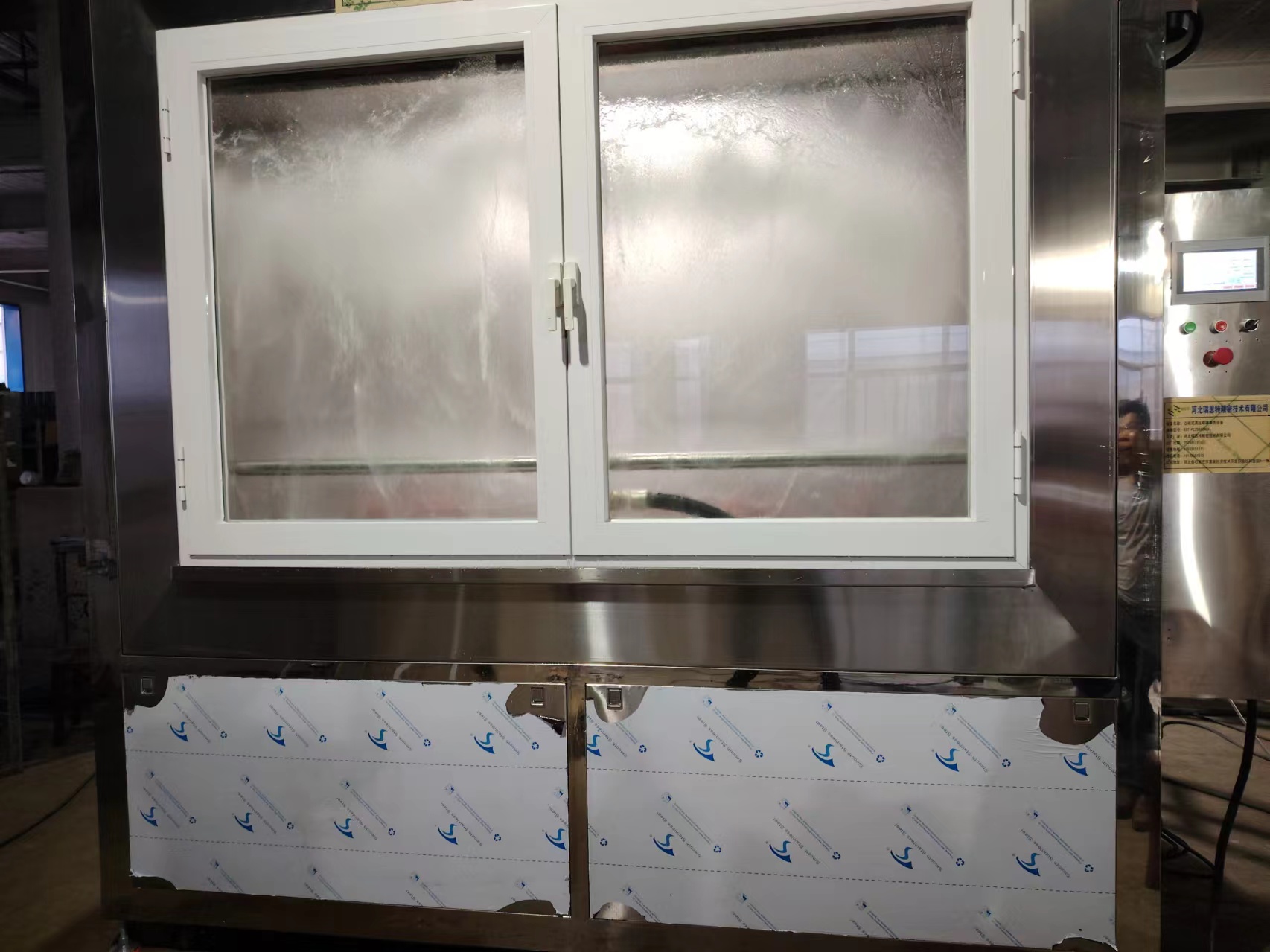 設(shè)備主要組成部分:不銹鋼腔室,工裝卡具機構(gòu),密封門,高壓噴淋系統(tǒng),風(fēng)刀切水系統(tǒng),循環(huán)過濾系統(tǒng),電氣控制系統(tǒng)、PLC控制系統(tǒng)、觸摸屏操作、霧氣回收機等組成。